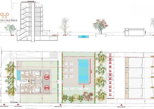 Es besteht aus zwei Gebäuden: eines für Eigentumswohnungen mit sechs Stockwerken und das andere mit lediglich vier Gewerbeobjekten, die einen direkten Zugang von der Straße aus bieten.
