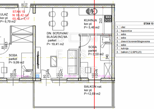 Gesamte Wohnfläche beträgt 68,59 m² einschließlich eines Balkons von 12,69 m², berechnet mit dem entsprechenden Koeffizienten (3,17 m²)