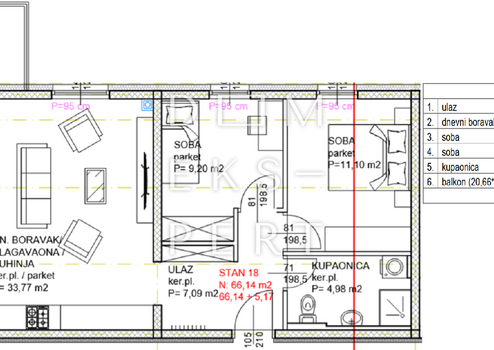 Gesamte Wohnfläche beträgt 71,31 m² einschließlich eines Balkons von 20,66 m², berechnet mit dem entsprechenden Koeffizienten (5,17 m²)
