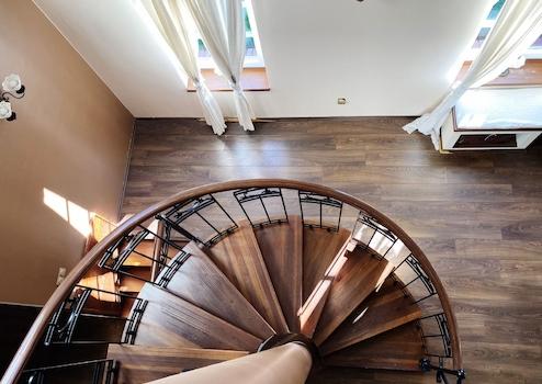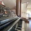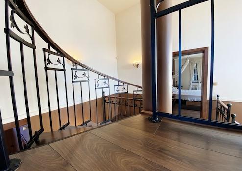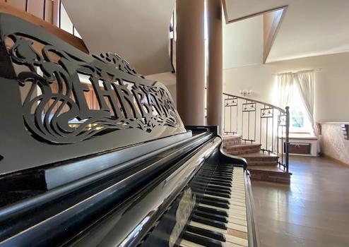 A nappali központi eleme a gyönyörűen ívelt csigalépcső és az Ehrbar zongora.