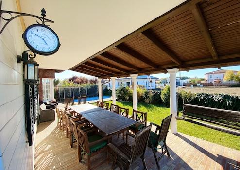 57 m² große untere Terrasse mit Blick auf den Pool.