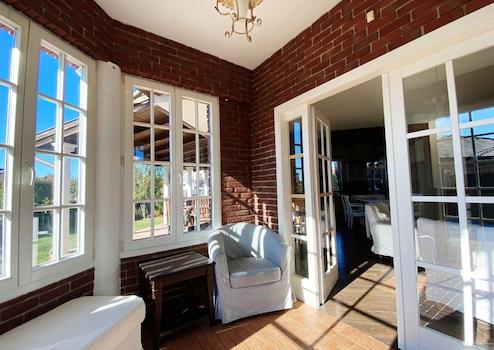 Von hier aus öffnet sich ein 8 m² großer, schneeweißer, geteilter Fenster-Wintergarten.