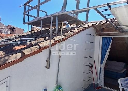 Im oberen Stockwerk befinden sich zwei weitere Räume, ein zweites Badezimmer mit Dusche sowie eine wunderschöne Terrasse, ideal zum Entspannen. Die teilweise überdachte Terrasse bietet einen herrlichen Blick auf den Glockenturm der Kirche der Heiligen Euphemia und ist der perfekte Ort, um laue Sommerabende zu genießen. Von der Terrasse aus gelangt man zu einem privaten Austritt mit Blick auf das Meer und einen Teil des Hafens von Rovinj – ein bezaubernder Platz für den Morgenkaffee oder einen Sundowner.