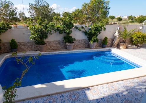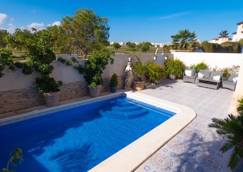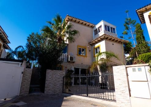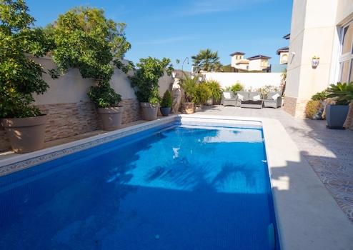 Am Ende einer ruhigen Sackgasse in Playa Flamenca gelegen, bietet diese atemberaubende, nach Süden ausgerichtete, freistehende Villa mit privatem Pool großzügige Wohnräume, die sich über drei Etagen erstrecken. Vom hinteren Garten und der Dachterrasse aus hat man einen wunderschönen Ausblick.