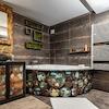 Das Wohnzimmer verfügt außerdem über zusätzliche maßgefertigte Wandverkleidungen und ein Aquarium. Der Wohn-Küchen-Essbereich ist mit der Terrasse verbunden und im Sommer kann das Wohnzimmer mit einem Handgriff mit der Terrasse verbunden werden.