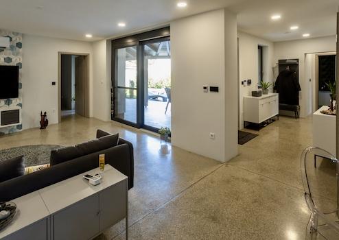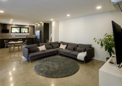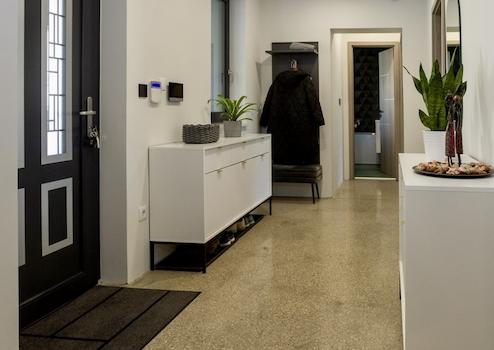 Az egész házban kavicsos, csiszolt beton padló akadálymentesen lett kialakítva, minden helyiségben padlófűtéssel. A fűtést Viessmann kombi gázkazán biztosítja, a helyiségek és szobák hőmérsékletét külön lehet szabályozni.