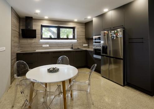 Az egyik fürdőszoba privát, közvetlen a szülői hálószobából nyílik. A konyhában hatalmas, egyedileg, méretre készített konyhabútor található.