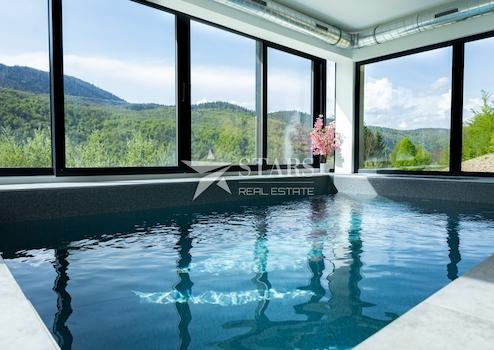 Das Untergeschoss beherbergt einen eleganten Wellnessbereich und ein Hallenbad, ausgestattet mit fortschrittlichen Systemen wie Luftrekuperation, Entfeuchtung, Wärmetauschern und Wärmepumpen. Jeder Raum verfügt über individuelle Temperaturregler, die über mobile Geräte steuerbar sind.