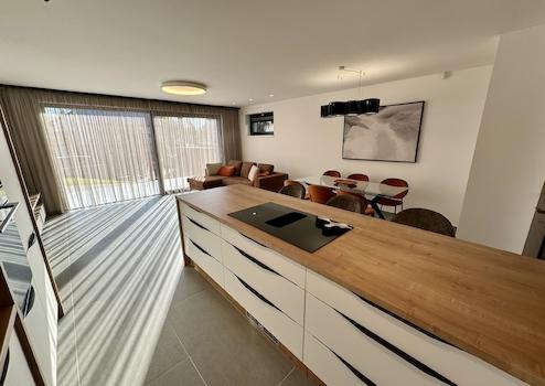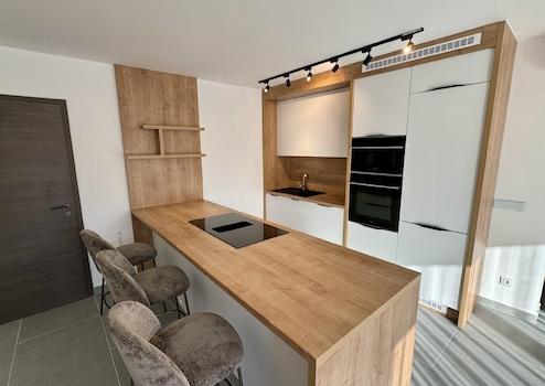 ▪ in der Küche mattweiße/eichenfarbene DiMarco-Möbel mit LED-Beleuchtung und Whirlpool-Geräten der A+ und A++-Klasse