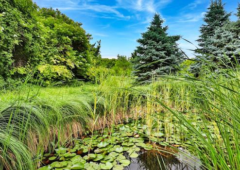 Zwei Gartenteiche mit Fischen, künstlicher Bachlauf mit Wasserumwälzung, Wege, Treppen, Gartenbeleuchtung. Der gesamte Park ist eingezäunt und mit einem automatischen Bewässerungssystem aus einem eigenen Brunnen ausgestattet. Regenwasser wird in unterirdischen Tanks gesammelt. Die Bewässerung kann über einen Gartenwasserhahn mit Hilfe der Pumpe im Maschinenraum erfolgen. Am Rand des Grundstücks gibt es einen hölzernen Lagerraum für Gartengeräte und -werkzeuge sowie einen Lagerraum für Brennholz (18 m2), dahinter einen eingezäunten „Hinterhof“ mit eingebautem Kompostbehälter.