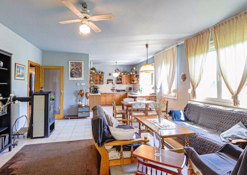 Die kleinere Wohnung ist 108 m2 groß, Wohn-Esszimmer mit amerikanischer Küche, 2 Schlafzimmer, Bad/WC, Gäste-WC, Speisekammer, Gewächshaus-Wintergarten, überdachte Terrasse (8 m2).