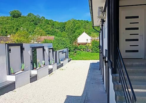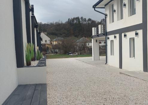 Das untere Untergeschoss ist über eine Innentreppe und einen Außeneingang erreichbar. Es bietet einen völlig unabhängigen, separaten Wohnraum oder eignet sich für die Ausübung eines Home-Business, sei es eine Bürotätigkeit, ein Schönheitssalon oder jede andere Idee, die auf 150 m² umgesetzt werden kann. Der untere Teil der Wohnung verfügt über ein Wohnzimmer mit amerikanischer Küche, 1 Schlafzimmer, Badezimmer, großen Abstellraum, Flur und Waschküche. Die untere Terrasse ist auch über das Wohnzimmer zugänglich. Die Terrassen bieten ein unvergleichliches Panorama auf die Gerecse-Berge.