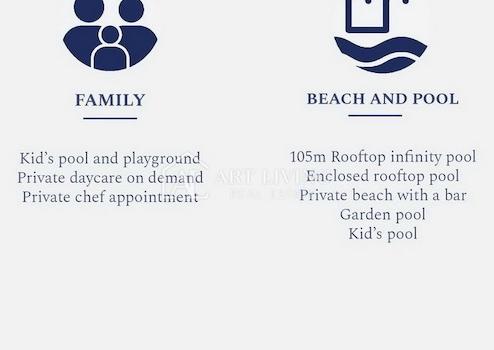 Das Resort ist abgeschlossen und bietet einen Sicherheits- und Wartungsservice. Den Bewohnern steht eine breite Palette an Annehmlichkeiten zur Verfügung: Restaurants, Geschäfte, Bars, ein Golfplatz, ein Fitnessstudio, ein Wellness- und SPA-Bereich sowie ein Infinity-Pool auf dem Dach mit einzigartigem Panoramablick auf das Meer und die Bucht von Savudrija. Die Strände sind nur 100 Meter vom Resort entfernt.