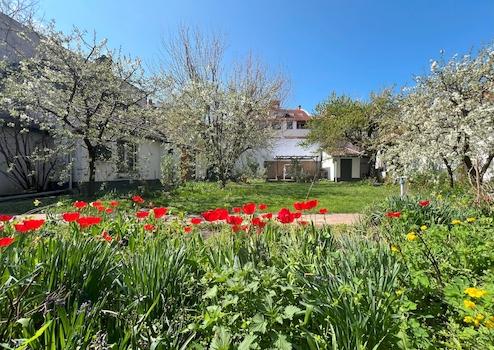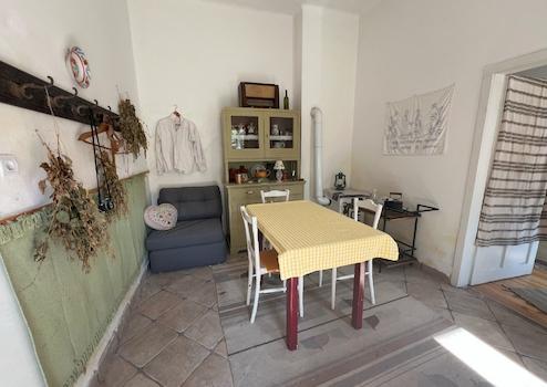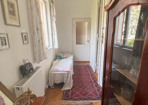 Az ingatlan jellemzői: A 90 m²-es első lakrészt néhány éve teljesen felújították, miközben megőrizték a klasszikus polgári stílusát. A felújítás során új tetőt és hőszigetelt fa nyílászárókat kapott. Külső és belső falait szigetelték fugával benyomott lemezzel. Emellett megújultak a víz- és elektromos rendszerek, valamint a fürdőszobák és a konyhák is modernizálódtak. Az épület tágas előszobába vezet, ahol egy külön WC is található. Innen nyílik az étkező, egy jól felszerelt konyha, a fürdőszoba, a nappali, és egy kényelmes hálószoba.