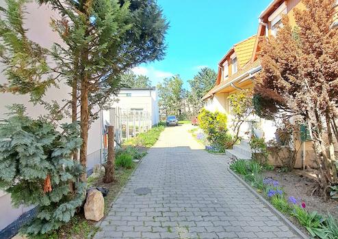 Auf dem 1113 qm großen Grundstück befindet sich ein 4-Zimmer-Reihenhaus. Zum Verkauf steht der straßenseitige Teil, der von der Straße aus befahrbar ist und auch die Garage verfügt über ein automatisches Garagentor.