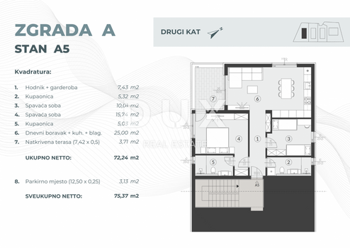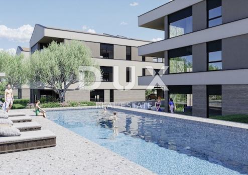 Im DUX Immobilienangebot bieten wir Ihnen ein neues Projekt an, das als privater Komplex mit einem 85 m2 großen Swimmingpool exklusiv für die Bewohner dieser zukünftigen wunderschönen Anlage konzipiert ist! Dies ist ein Projekt für einen Luxuskomplex mit 23 Wohneinheiten, dessen Konzept in dieser Gegend Istriens einzigartig ist! Bei der betreffenden Immobilie handelt es sich um eine Wohnung im zweiten Stock mit 2 Schlafzimmern! Es handelt sich um eine Wohnung, die insgesamt 75,37 m² Wohnfläche und einen PKW-Stellplatz bietet! Der Komplex bietet insgesamt 4 Gebäude, die über eine eigene gesicherte Fahrzeugzufahrt über ein ferngesteuertes Tor verfügen. Der hintere Gebäudeteil bzw. der Parkplatz wird rund um die Uhr videoüberwacht und gewährleistet somit maximale Privatsphäre bei der Ein- und Ausfahrt sowie Fahrzeugsicherheit auf dem Parkplatz. LAGE: Der Komplex befindet sich in einer der begehrtesten Gegenden für Investitionen und zum Leben in diesem Teil Istriens und der sehr berühmte Strand Hidrobaza liegt 1,2 km vom Komplex entfernt. WOHNUNGSTYPEN: Einzimmerwohnung – (1S+DB) – 2x Zweizimmerwohnung – (S2+DB) – 9x Dreizimmerwohnung – (3S+DB) – 12x WOHNUNGSAUSSTATTUNG: Deckenhöhe – 2,70 m Fußbodenheizung in den Badezimmern + Möglichkeit einer Aufzahlung für andere Zimmer (bis zu einem bestimmten Niveau) Hochwertige Keramikfliesen PVC-Tischlerei „französischer“ Art an allen Außenöffnungen mit Rollläden und Moskitonetzen Erstklassige Badezimmerausstattung von renommierten Herstellern Mindestens eine Klimaanlage einer renommierten Marke pro Wohnung, mit Vorbereitung für eine Inneneinheit in allen Zimmern. Externe Serviceeinheiten werden auf dem Dach des Gebäudes untergebracht. Hochwertige Innenschreinereiarbeiten aus Holz. Einbruchsichere Eingangstüren mit hoher Schalldämmung und größerer Feuerverzögerung. Möglichkeit, die Endschicht in Form von Keramik, Parkett oder Laminat für Schlafzimmer zu wählen. Vorbereitung für Ladegeräte für Elektroautos auf jedem dafür vorgesehenen Parkplatz. Bei allen Fragen zur Zahlungsabwicklung, Organisation von Besichtigungen vor Ort, wenden Sie sich vertrauensvoll an uns! Käufer von der Grunderwerbsteuer befreit!