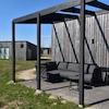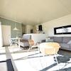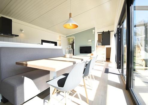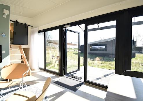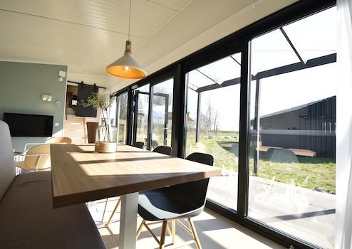 Das Wohnzimmer ist durch die große Fensterfront und die Flügeltüren zur Terrasse wunderbar hell und freundlich. Der offene Grundriss schafft fließende Übergänge zur modernen Küche und dem gemütlichen Essbereich mit Esstisch und Sitzbank. Ideal, um gemeinsam zu essen, zu entspannen oder einfach die ruhige Atmosphäre im Ferienhaus am Wasser in den Niederlanden zu genießen.