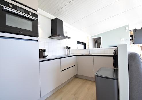Die Küche ist in einer stilvollen offenen Eckanordnung gestaltet, mit einer Arbeitsplatte in passendem Grauton für ein harmonisches Gesamtbild. Ausgestattet mit modernen Geräten: Induktionskochfeld, Kühlschrank mit Gefrierfach, Quooker, Kombimikrowelle, eine schwarze Dunstabzugshaube und Geschirrspüler. Ideal für einen rundum gelungenen Kochgenuss im Urlaub.