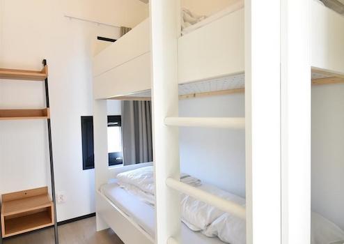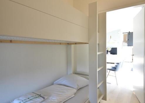 Dieses kompakte Schlafzimmer eignet sich perfekt für Kinder oder Gäste. Es verfügt über ein Etagenbett, einen offenen Kleiderschrank und ein kleines Fenster, das für Tageslicht und Frischluft sorgt. Eine praktische und freundliche Ergänzung zum Ferienhaus.