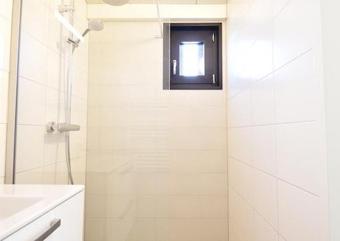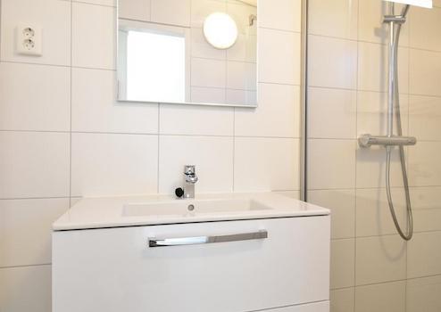 Dieses Badezimmer im Obergeschoss ist stilvoll ausgestattet mit einer ebenerdigen Dusche, einem Waschbecken mit Unterschrank sowie einem Designheizkörper. Ideal für entspannte Momente nach einem aktiven Urlaubstag.