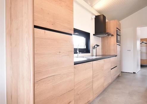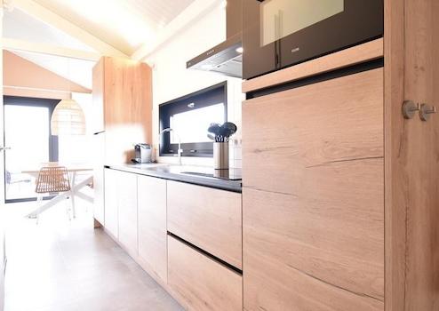 Die Küche ist in einer geraden Anordnung gestaltet und überzeugt mit einem warmem Holzton, der Gemütlichkeit ausstrahlt. Über der Spüle befindet sich ein Fenster, das für viel Tageslicht sorgt. Zur Ausstattung gehören Einbaugeräte wie eine Dunstabzugshaube, Kombi-Mikrowelle, Geschirrspüler und ein Kühlschrank mit Gefrierfach.