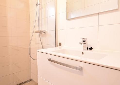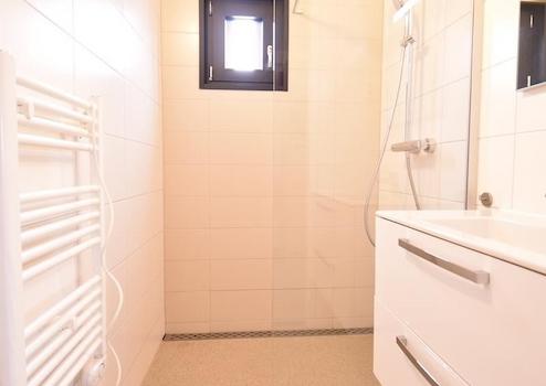 Das Badezimmer verfügt über eine ebenerdige Dusche, ein Waschbecken mit Unterschrank und einen beleuchteten Spiegel. Ein Design-Heizkörper sorgt für wohlige Wärme. Durch das kleine Fenster kommt Tageslicht herein und es lässt sich gut lüften.
