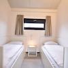 Dieses Schlafzimmer ist mit zwei einzelnen Boxspringbetten ausgestattet, dazwischen steht ein Nachttisch. Ein Fenster sorgt für Tageslicht und frische Luft, und der Schrank bietet ausreichend Stauraum für Kleidung und Gepäck.