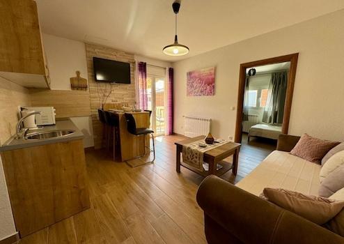 Über eine Außentreppe gelangt man in den ersten Stock des Hauses, wo sich zwei kategorisierte Wohnungen befinden, die zur touristischen Vermietung bestimmt sind. Die größere Wohnung verfügt über zwei Schlafzimmer, ein Wohnzimmer und ein Badezimmer, während die kleinere Wohnung über ein Schlafzimmer, ein Wohnzimmer und ein Badezimmer verfügt. Beide Apartments verfügen über eigene Terrassen, die den Gästen Privatsphäre und den Genuss der mediterranen Umgebung ermöglichen.