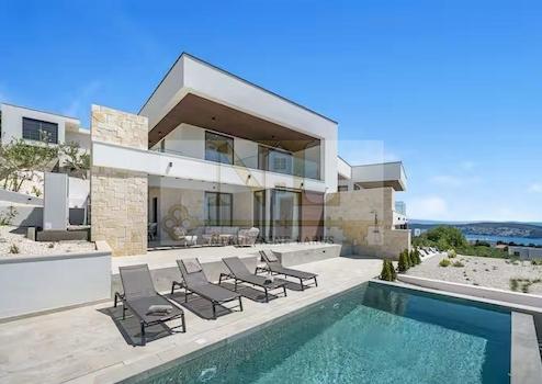Diese neue luxuriöse und moderne Villa liegt auf einem sanften Hügel mit Panoramablick auf das Meer und die nahegelegenen Inseln.