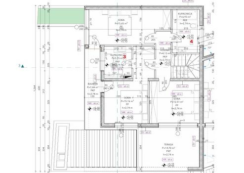 Im ersten Stock der Villa befinden sich drei Schlafzimmer (15,65 m2, 15,16 m2, 12,51 m2) und zwei Badezimmer, wobei zwei Schlafzimmer Zugang zu einem Balkon (7,44 m2) und das Hauptschlafzimmer Zugang zu einer Terrasse (14,70 m2) haben.