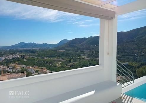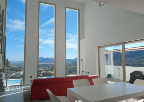 Fünf Meter hohe, bodentiefe Fenster eröffnen einen atemberaubenden Blick über das Tal von Pego bis hin zum Meer – bei klarer Sicht sogar bis nach Ibiza.