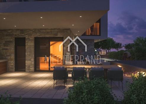 Family house-villa for sale in Primošten, currently in the phase of finishing the construction. It is settled in the quiet part of Primošten, part called Plat on the land of 550 m2, 300 m from the sea and 750 m from the center of Primošten. The villa will be in 2 floors. On the ground floor there will be a garage, engine room, wellnes, kitchen with dining room and living room. In the yard are planned covered summer kitchen and a swimming pool. With the staircase you go to the second floor in which there are 4 bedrooms each with its own bathroom and dressing room. There is also a storage room and a hallway. The main bedroom has an exit to spacious covered terrace of 22 m2.