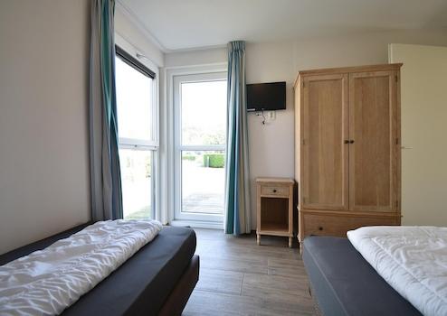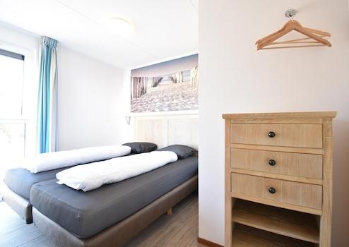 Das Schlafzimmer hat zwei bequeme Boxspringbetten, ein großes Fenster zum Boden und einen praktischen Kleiderschrank. Ein schöner Ort, um sich nach einem Tag am Strand zurückzuziehen.