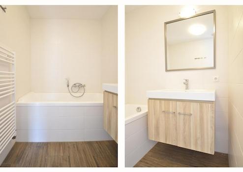 Direkt an das Schlafzimmer angrenzend befindet sich das eigene Badezimmer mit einer geräumigen Badewanne, einem Waschbeckenschrank aus Holz in moderner Optik und einem Designheizkörper für zusätzlichen Komfort - alles für einen entspannten Start oder Ausklang des Tages.