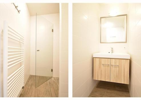 Das zweite Badezimmer verfügt über eine moderne Dusche mit Glastür, einen stilvollen Waschbeckenschrank in einem warmen Holzton und einen Designheizkörper. Ein schöner, komfortabler Raum für den täglichen Gebrauch.