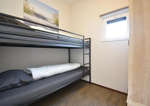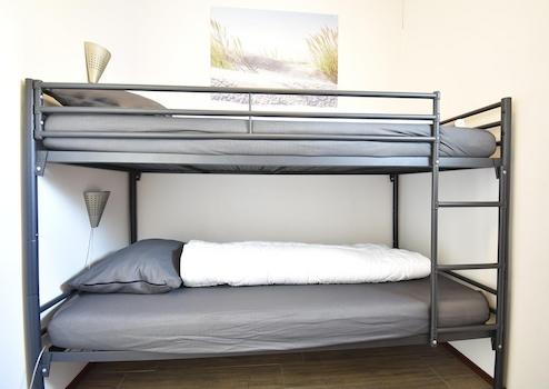Dieses gemütliche Schlafzimmer ist mit einem Etagenbett ausgestattet, ideal für die jüngsten Gäste. Es gibt einen praktischen Kleiderschrank und ein kleines Fenster für natürliches Licht und frische Luft.