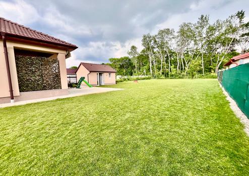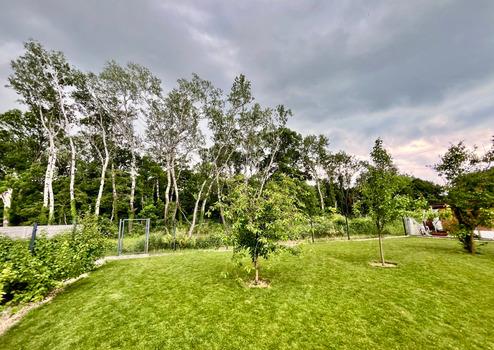 A csendes, rendezett kertben található automata öntözőrendszer megkönnyíti a növények gondozását, míg a kerti tároló praktikus megoldást kínál a kerti eszközök tárolására. A gyepszőnyeget robotfűnyíró nyírja, amit az ár szintén tartalmaz!
