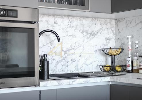 Sie besteht aus Wohnzimmer, Küche mit Essbereich, zwei Schlafzimmern, Badezimmer, Flur und Loggia.