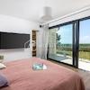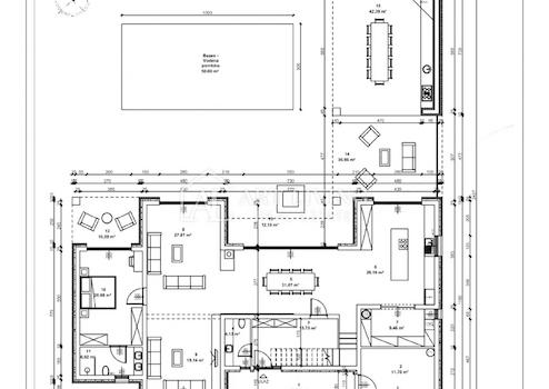 Vom Wohnzimmer aus gelangt man durch große Glasfronten auf Terrassen und eine 162 m² große Sonnenterrasse sowie in die Sommerküche mit Grill, die den 50 m² großen Pool umgeben. Außerdem gibt es einen großen eingezäunten Garten mit einem Olivenhain von ca. 2.000 m².