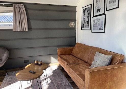 Das geschmackvoll eingerichtete Wohnzimmer bietet eine komfortable Sitz- und Essecke. Der Raum ist stilvoll mit hochwertigen Möbeln ausgestattet.