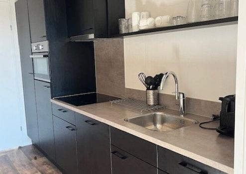 Die Küche in elegantem Schwarz ist mit hochwertigen Einbaugeräten ausgestattet, darunter Induktionskochfeld, Kombimikrowelle und Geschirrspüler. Sie verbindet Stil und Funktionalität perfekt mit dem Wohnbereich.