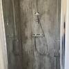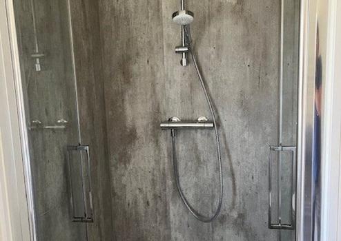 Das gepflegte Badezimmer liegt zentral zwischen den Schlafzimmern und bietet eine großzügige Duschkabine mit Glastür, ein WC und ein Waschtisch mit Spiegel – alles in neutralem Farbschema gehalten.