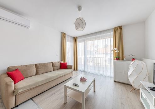 **Korszerű Épület és Felszereltség:** Az épületben lift található, a lakás házközponti fűtésrendszerrel rendelkezik, amihez egyedi almérő is tartozik. Ez lehetővé teszi a költségek hatékony kezelését, ami a bérlők számára fontos szempont. Az ingatlan teljesen felszerelt és klimatizált, biztosítva a kényelmet még a nyári hőségben is.