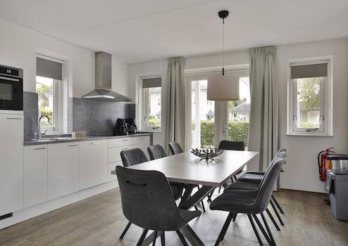 Die offene Küche befindet sich auf der Rückseite des Hauses in gerader Anordnung und ist mit modernen Einbaugeräten ausgestattet. Die klaren, weißen Küchenschränke harmonieren perfekt mit der dunklen Arbeitsplatte. Neben der Küche steht ein großer Esstisch mit acht Stühlen – ideal für gesellige Mahlzeiten mit Familie oder Freunden. Doppelflügelige Türen führen direkt auf die Terrasse und verbinden so Innen- und Außenbereich nahtlos.
