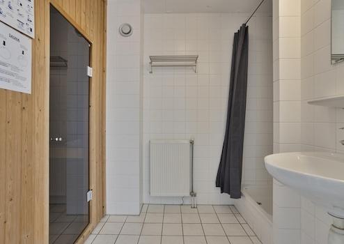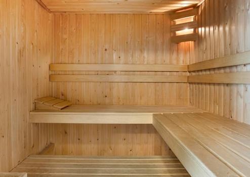 Dieses luxuriöse Badezimmer ist eine wahre Wohlfühloase. Entspannen Sie in Ihrer eigenen privaten Sauna nach einem Tag am Strand oder auf dem Wasser. Eine Dusche und ein stilvolles Waschbecken vervollständigen den Komfort – für einen erholsamen und angenehmen Aufenthalt.