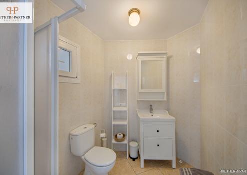 Außerdem gibt es im Erdgeschoss ein Badezimmer und einen Zugang zum Abstellraum und zur privaten Garage, wo sich auf der Tank der für das Heizöl befindet.