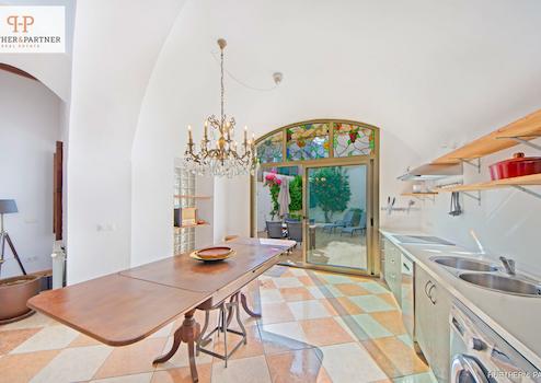 Am Ende des Flures gibt es einen Kaminofen und eine große Küche mit Essbereich und Ausgang zum Innenhof.