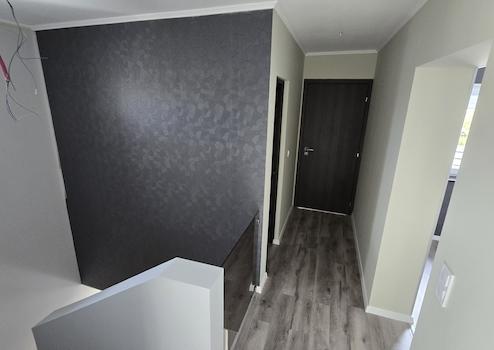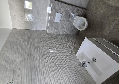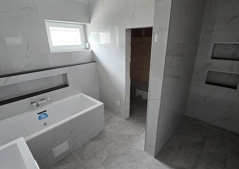 Badezimmer mit Badewanne, Dusche und Sauna (Sauna wird installiert), Flur, Eingangsbereich, Terrasse.