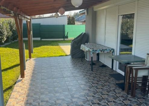 A házhoz tartozik egy nagy fedett terasz, amely a nappaliból nyílik.