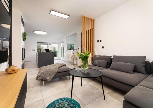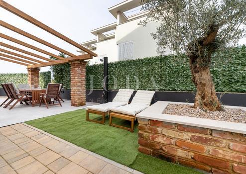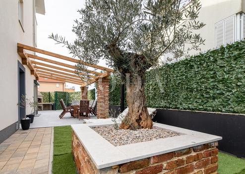 Zum Verkauf steht eine Wohnung mit einer Fläche von 102,37 m2, die auf drei Etagen ein Wohnzimmer mit Küche und Essbereich, zwei Schlafzimmer, zwei Badezimmer und eine schöne Terrasse mit Meerblick umfasst. Zur Wohnung gehören eine Gartenfläche von 77,01 m2 und zwei PKW-Stellplätze.